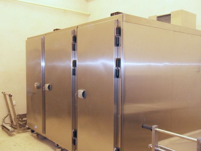 Instalacjê ch³odnicz± stanowi± nowoczesne agregaty ch³odnicze wykonane w formie mono bloku zespolone z ch³odnic± wyposa¿on± w wentylator i grza³kê automatycznego odszraniania. Sterowanie zespo³em ch³odzenia odbywa siê urz±dzeniem elektronicznym z wy¶wietlaczem aktualnej temperatury w komorze i odczytem zaprogramowanych parametrów pracy komory, oraz wska¼nikami sygnalizuj±cymi aktualn± fazê pracy agregatu. Instalacja ch³odnicza nie wymaga ¿adnej obs³ugi i utrzymuje temperaturê wnêtrza komory w zakresie 0-4st.C. Dla specjalnych celów wykonujemy równie¿ komory o temperaturze wnêtrza -18st.C, oraz zblokowane uk³ady komór na temperatury dodatnie i mro¼nie.